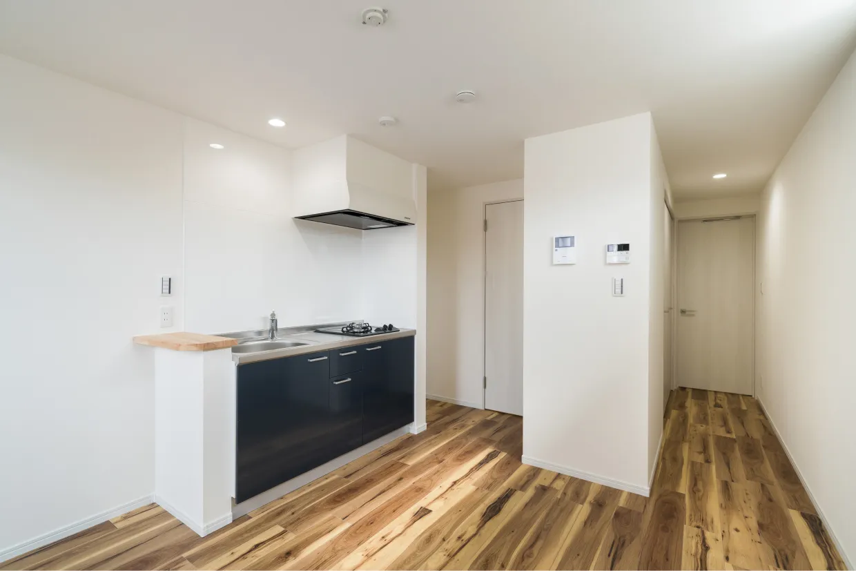 一方、内観デザインはオーナー様の2LDK相当(約65m2)の部屋をスタイリッシュな1Rでご提案。生活がしやすく、開放感のあるコンドミニアムのような空間が特徴です。